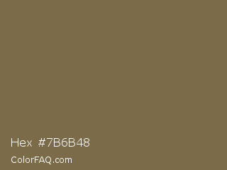 Hex #7b6b48 Color is a normal orange color and the nearest color is Raw Umber #826644. Hex code #7b6b48 and RGB value is rgb(123,107,72). In RGB color space, this color is composed of 48% red, 42% green, 28% blue, In CMYK color space, this color is composed of 0% cyan, 13% magenta, 41% yellow , 52% black , In HSL color space, this color has a hue angle of 41° , 26% saturation and 38% lightness.