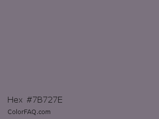 Hex #7b727e Color is a normal purple color and the nearest color is Boulder #7a7a7a. Hex code #7b727e and RGB value is rgb(123,114,126). In RGB color space, this color is composed of 48% red, 45% green, 49% blue, In CMYK color space, this color is composed of 2% cyan, 10% magenta, 0% yellow , 51% black , In HSL color space, this color has a hue angle of 285° , 5% saturation and 47% lightness.