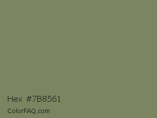 Hex #7b8561 Color is a normal lime color and the nearest color is Flax Smoke #7b8265. Hex code #7b8561 and RGB value is rgb(123,133,97). In RGB color space, this color is composed of 48% red, 52% green, 38% blue, In CMYK color space, this color is composed of 8% cyan, 0% magenta, 27% yellow , 48% black , In HSL color space, this color has a hue angle of 77° , 16% saturation and 45% lightness.