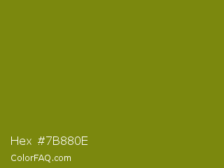 Hex #7b880e Color is a dark yellow color and the nearest color is Trendy Green #7c881a. Hex code #7b880e and RGB value is rgb(123,136,14). In RGB color space, this color is composed of 48% red, 53% green, 5% blue, In CMYK color space, this color is composed of 10% cyan, 0% magenta, 90% yellow , 47% black , In HSL color space, this color has a hue angle of 66° , 81% saturation and 29% lightness.