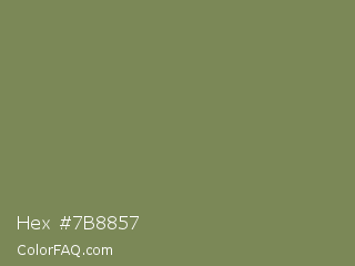 Hex #7b8857 Color is a normal lime color and the nearest color is Flax Smoke #7b8265. Hex code #7b8857 and RGB value is rgb(123,136,87). In RGB color space, this color is composed of 48% red, 53% green, 34% blue, In CMYK color space, this color is composed of 10% cyan, 0% magenta, 36% yellow , 47% black , In HSL color space, this color has a hue angle of 76° , 22% saturation and 44% lightness.