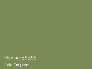 Hex #7b8b56 Color is a normal lime color and the nearest color is Flax Smoke #7b8265. Hex code #7b8b56 and RGB value is rgb(123,139,86). In RGB color space, this color is composed of 48% red, 55% green, 34% blue, In CMYK color space, this color is composed of 12% cyan, 0% magenta, 38% yellow , 45% black , In HSL color space, this color has a hue angle of 78° , 24% saturation and 44% lightness.