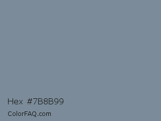 Hex #7b8b99 Color is a normal blue color and the nearest color is Light Slate Gray #778899. Hex code #7b8b99 and RGB value is rgb(123,139,153). In RGB color space, this color is composed of 48% red, 55% green, 60% blue, In CMYK color space, this color is composed of 20% cyan, 9% magenta, 0% yellow , 40% black , In HSL color space, this color has a hue angle of 208° , 13% saturation and 54% lightness.