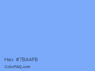 Hex #7baafb Color is a light blue color and the nearest color is French Sky Blue #77b5fe. Hex code #7baafb and RGB value is rgb(123,170,251). In RGB color space, this color is composed of 48% red, 67% green, 98% blue, In CMYK color space, this color is composed of 51% cyan, 32% magenta, 0% yellow , 2% black , In HSL color space, this color has a hue angle of 218° , 94% saturation and 73% lightness.