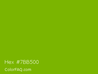 Hex #7bb500 Color is a normal lime color and the nearest color is Apple Green #8db600. Hex code #7bb500 and RGB value is rgb(123,181,0). In RGB color space, this color is composed of 48% red, 71% green, 0% blue, In CMYK color space, this color is composed of 32% cyan, 0% magenta, 100% yellow , 29% black , In HSL color space, this color has a hue angle of 79° , 100% saturation and 35% lightness.