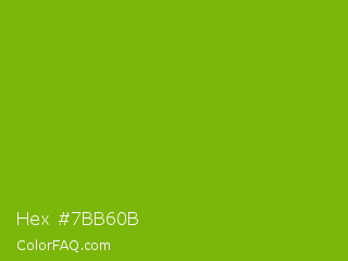 Hex #7bb60b Color is a normal green color and the nearest color is Lima #76bd17. Hex code #7bb60b and RGB value is rgb(123,182,11). In RGB color space, this color is composed of 48% red, 71% green, 4% blue, In CMYK color space, this color is composed of 32% cyan, 0% magenta, 94% yellow , 29% black , In HSL color space, this color has a hue angle of 81° , 89% saturation and 38% lightness.