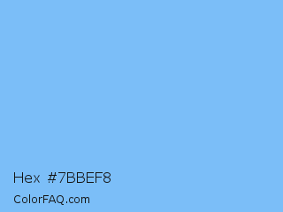 Hex #7bbef8 Color is a light blue color and the nearest color is Very Light Azure #74bbfb. Hex code #7bbef8 and RGB value is rgb(123,190,248). In RGB color space, this color is composed of 48% red, 75% green, 97% blue, In CMYK color space, this color is composed of 50% cyan, 23% magenta, 0% yellow , 3% black , In HSL color space, this color has a hue angle of 208° , 90% saturation and 73% lightness.