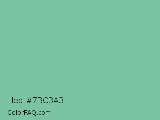 Hex #7bc3a3 Color is a light green color and the nearest color is Acapulco #7cb0a1. Hex code #7bc3a3 and RGB value is rgb(123,195,163). In RGB color space, this color is composed of 48% red, 76% green, 64% blue, In CMYK color space, this color is composed of 37% cyan, 0% magenta, 16% yellow , 24% black , In HSL color space, this color has a hue angle of 153° , 38% saturation and 62% lightness.