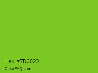 Hex #7bc823 Color is a normal green color and the nearest color is Lima #76bd17. Hex code #7bc823 and RGB value is rgb(123,200,35). In RGB color space, this color is composed of 48% red, 78% green, 14% blue, In CMYK color space, this color is composed of 39% cyan, 0% magenta, 83% yellow , 22% black , In HSL color space, this color has a hue angle of 88° , 70% saturation and 46% lightness.