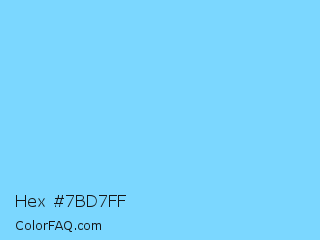 Hex #7bd7ff Color is a light blue color and the nearest color is Pale Cyan #87d3f8. Hex code #7bd7ff and RGB value is rgb(123,215,255). In RGB color space, this color is composed of 48% red, 84% green, 100% blue, In CMYK color space, this color is composed of 52% cyan, 16% magenta, 0% yellow , 0% black , In HSL color space, this color has a hue angle of 198° , 100% saturation and 74% lightness.