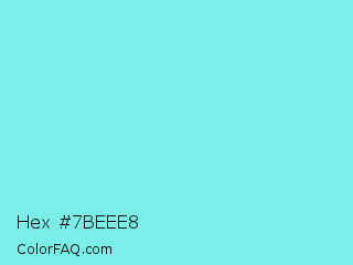 Hex #7beee8 Color is a light cyan color and the nearest color is Spray #79deec. Hex code #7beee8 and RGB value is rgb(123,238,232). In RGB color space, this color is composed of 48% red, 93% green, 91% blue, In CMYK color space, this color is composed of 48% cyan, 0% magenta, 3% yellow , 7% black , In HSL color space, this color has a hue angle of 177° , 77% saturation and 71% lightness.