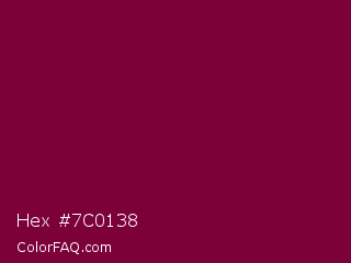 Hex #7c0138 Color is a dark rose color and the nearest color is Siren #7a013a. Hex code #7c0138 and RGB value is rgb(124,1,56). In RGB color space, this color is composed of 49% red, 0% green, 22% blue, In CMYK color space, this color is composed of 0% cyan, 99% magenta, 55% yellow , 51% black , In HSL color space, this color has a hue angle of 333° , 98% saturation and 25% lightness.