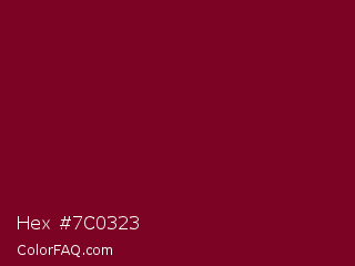 Hex #7c0323 Color is a dark rose color and the nearest color is Burgundy #800020. Hex code #7c0323 and RGB value is rgb(124,3,35). In RGB color space, this color is composed of 49% red, 1% green, 14% blue, In CMYK color space, this color is composed of 0% cyan, 98% magenta, 72% yellow , 51% black , In HSL color space, this color has a hue angle of 344° , 95% saturation and 25% lightness.