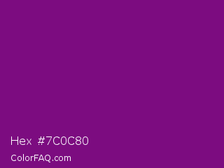 Hex #7c0c80 Color is a dark magenta color and the nearest color is Patriarch #800080. Hex code #7c0c80 and RGB value is rgb(124,12,128). In RGB color space, this color is composed of 49% red, 5% green, 50% blue, In CMYK color space, this color is composed of 3% cyan, 91% magenta, 0% yellow , 50% black , In HSL color space, this color has a hue angle of 298° , 83% saturation and 27% lightness.