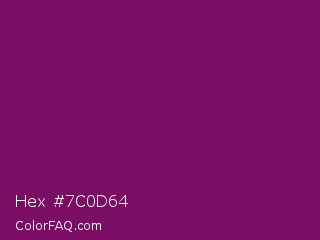 Hex #7c0d64 Color is a dark magenta color and the nearest color is Cardinal Pink #8c055e. Hex code #7c0d64 and RGB value is rgb(124,13,100). In RGB color space, this color is composed of 49% red, 5% green, 39% blue, In CMYK color space, this color is composed of 0% cyan, 90% magenta, 19% yellow , 51% black , In HSL color space, this color has a hue angle of 313° , 81% saturation and 27% lightness.