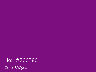 Hex #7c0e80 Color is a dark magenta color and the nearest color is Patriarch #800080. Hex code #7c0e80 and RGB value is rgb(124,14,128). In RGB color space, this color is composed of 49% red, 5% green, 50% blue, In CMYK color space, this color is composed of 3% cyan, 89% magenta, 0% yellow , 50% black , In HSL color space, this color has a hue angle of 298° , 80% saturation and 28% lightness.
