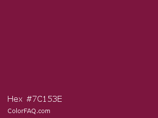 Hex #7c153e Color is a dark rose color and the nearest color is Claret #7f1734. Hex code #7c153e and RGB value is rgb(124,21,62). In RGB color space, this color is composed of 49% red, 8% green, 24% blue, In CMYK color space, this color is composed of 0% cyan, 83% magenta, 50% yellow , 51% black , In HSL color space, this color has a hue angle of 336° , 71% saturation and 28% lightness.