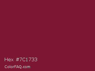 Hex #7c1733 Color is a dark rose color and the nearest color is Claret #7f1734. Hex code #7c1733 and RGB value is rgb(124,23,51). In RGB color space, this color is composed of 49% red, 9% green, 20% blue, In CMYK color space, this color is composed of 0% cyan, 81% magenta, 59% yellow , 51% black , In HSL color space, this color has a hue angle of 343° , 69% saturation and 29% lightness.