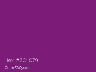 Hex #7c1c79 Color is a dark magenta color and the nearest color is Midnight #702670. Hex code #7c1c79 and RGB value is rgb(124,28,121). In RGB color space, this color is composed of 49% red, 11% green, 47% blue, In CMYK color space, this color is composed of 0% cyan, 77% magenta, 2% yellow , 51% black , In HSL color space, this color has a hue angle of 302° , 63% saturation and 30% lightness.