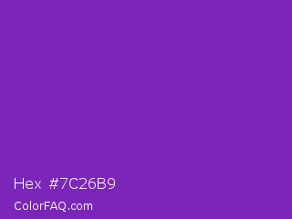 Hex #7c26b9 Color is a normal purple color and the nearest color is Grape #6f2da8. Hex code #7c26b9 and RGB value is rgb(124,38,185). In RGB color space, this color is composed of 49% red, 15% green, 73% blue, In CMYK color space, this color is composed of 33% cyan, 79% magenta, 0% yellow , 27% black , In HSL color space, this color has a hue angle of 275° , 66% saturation and 44% lightness.