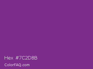 Hex #7c2d8b Color is a normal purple color and the nearest color is Vivid Violet #803790. Hex code #7c2d8b and RGB value is rgb(124,45,139). In RGB color space, this color is composed of 49% red, 18% green, 55% blue, In CMYK color space, this color is composed of 11% cyan, 68% magenta, 0% yellow , 45% black , In HSL color space, this color has a hue angle of 290° , 51% saturation and 36% lightness.