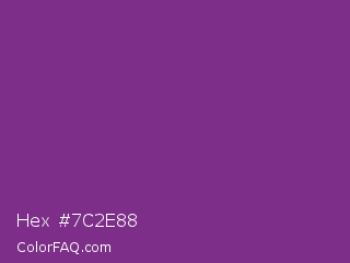 Hex #7c2e88 Color is a normal magenta color and the nearest color is Vivid Violet #803790. Hex code #7c2e88 and RGB value is rgb(124,46,136). In RGB color space, this color is composed of 49% red, 18% green, 53% blue, In CMYK color space, this color is composed of 9% cyan, 66% magenta, 0% yellow , 47% black , In HSL color space, this color has a hue angle of 292° , 49% saturation and 36% lightness.