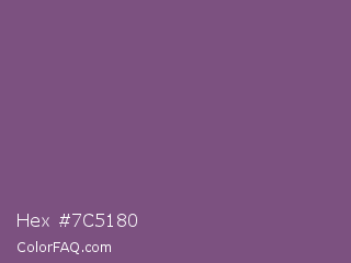 Hex #7c5180 Color is a normal magenta color and the nearest color is Razzmic Berry #8d4e85. Hex code #7c5180 and RGB value is rgb(124,81,128). In RGB color space, this color is composed of 49% red, 32% green, 50% blue, In CMYK color space, this color is composed of 3% cyan, 37% magenta, 0% yellow , 50% black , In HSL color space, this color has a hue angle of 295° , 22% saturation and 41% lightness.