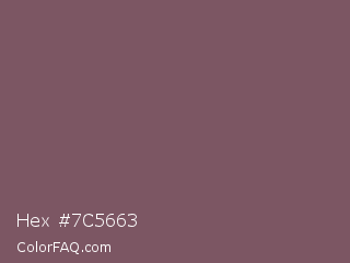 Hex #7c5663 Color is a normal rose color and the nearest color is Deep Taupe #7e5e60. Hex code #7c5663 and RGB value is rgb(124,86,99). In RGB color space, this color is composed of 49% red, 34% green, 39% blue, In CMYK color space, this color is composed of 0% cyan, 31% magenta, 20% yellow , 51% black , In HSL color space, this color has a hue angle of 339° , 18% saturation and 41% lightness.