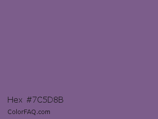 Hex #7c5d8b Color is a normal purple color and the nearest color is Chinese Violet #856088. Hex code #7c5d8b and RGB value is rgb(124,93,139). In RGB color space, this color is composed of 49% red, 36% green, 55% blue, In CMYK color space, this color is composed of 11% cyan, 33% magenta, 0% yellow , 45% black , In HSL color space, this color has a hue angle of 280° , 20% saturation and 45% lightness.