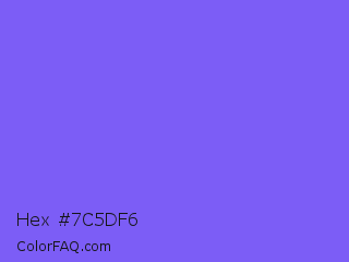 Hex #7c5df6 Color is a light indigo color and the nearest color is Medium Slate Blue #7b68ee. Hex code #7c5df6 and RGB value is rgb(124,93,246). In RGB color space, this color is composed of 49% red, 36% green, 96% blue, In CMYK color space, this color is composed of 50% cyan, 62% magenta, 0% yellow , 4% black , In HSL color space, this color has a hue angle of 252° , 89% saturation and 66% lightness.