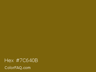 Hex #7c640b Color is a dark yellow color and the nearest color is Yukon Gold #7b6608. Hex code #7c640b and RGB value is rgb(124,100,11). In RGB color space, this color is composed of 49% red, 39% green, 4% blue, In CMYK color space, this color is composed of 0% cyan, 19% magenta, 91% yellow , 51% black , In HSL color space, this color has a hue angle of 47° , 84% saturation and 26% lightness.