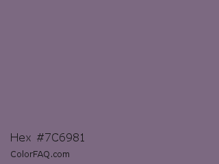 Hex #7c6981 Color is a normal purple color and the nearest color is Rum #796989. Hex code #7c6981 and RGB value is rgb(124,105,129). In RGB color space, this color is composed of 49% red, 41% green, 51% blue, In CMYK color space, this color is composed of 4% cyan, 19% magenta, 0% yellow , 49% black , In HSL color space, this color has a hue angle of 288° , 10% saturation and 46% lightness.