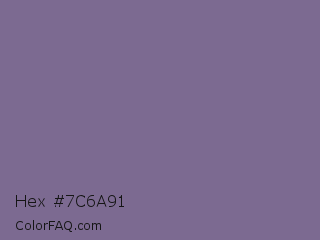 Hex #7c6a91 Color is a normal violet color and the nearest color is Rum #796989. Hex code #7c6a91 and RGB value is rgb(124,106,145). In RGB color space, this color is composed of 49% red, 42% green, 57% blue, In CMYK color space, this color is composed of 14% cyan, 27% magenta, 0% yellow , 43% black , In HSL color space, this color has a hue angle of 268° , 16% saturation and 49% lightness.