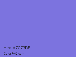 Hex #7c73df Color is a light indigo color and the nearest color is Moody Blue #7f76d3. Hex code #7c73df and RGB value is rgb(124,115,223). In RGB color space, this color is composed of 49% red, 45% green, 87% blue, In CMYK color space, this color is composed of 44% cyan, 48% magenta, 0% yellow , 13% black , In HSL color space, this color has a hue angle of 245° , 63% saturation and 66% lightness.