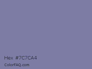 Hex #7c7ca4 Color is a normal blue color and the nearest color is Shadow Blue #778ba5. Hex code #7c7ca4 and RGB value is rgb(124,124,164). In RGB color space, this color is composed of 49% red, 49% green, 64% blue, In CMYK color space, this color is composed of 24% cyan, 24% magenta, 0% yellow , 36% black , In HSL color space, this color has a hue angle of 240° , 18% saturation and 56% lightness.