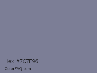 Hex #7c7e96 Color is a normal blue color and the nearest color is Waterloo #7b7c94. Hex code #7c7e96 and RGB value is rgb(124,126,150). In RGB color space, this color is composed of 49% red, 49% green, 59% blue, In CMYK color space, this color is composed of 17% cyan, 16% magenta, 0% yellow , 41% black , In HSL color space, this color has a hue angle of 235° , 11% saturation and 54% lightness.