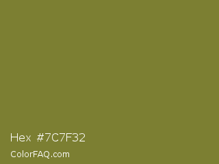 Hex #7c7f32 Color is a normal yellow color and the nearest color is Pesto #7c7631. Hex code #7c7f32 and RGB value is rgb(124,127,50). In RGB color space, this color is composed of 49% red, 50% green, 20% blue, In CMYK color space, this color is composed of 2% cyan, 0% magenta, 61% yellow , 50% black , In HSL color space, this color has a hue angle of 62° , 44% saturation and 35% lightness.
