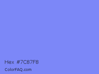 Hex #7c87f8 Color is a light blue color and the nearest color is Cornflower Blue #6495ed. Hex code #7c87f8 and RGB value is rgb(124,135,248). In RGB color space, this color is composed of 49% red, 53% green, 97% blue, In CMYK color space, this color is composed of 50% cyan, 46% magenta, 0% yellow , 3% black , In HSL color space, this color has a hue angle of 235° , 90% saturation and 73% lightness.