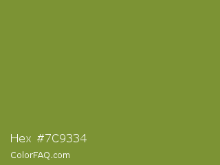Hex #7c9334 Color is a normal lime color and the nearest color is Wasabi #788a25. Hex code #7c9334 and RGB value is rgb(124,147,52). In RGB color space, this color is composed of 49% red, 58% green, 20% blue, In CMYK color space, this color is composed of 16% cyan, 0% magenta, 65% yellow , 42% black , In HSL color space, this color has a hue angle of 75° , 48% saturation and 39% lightness.
