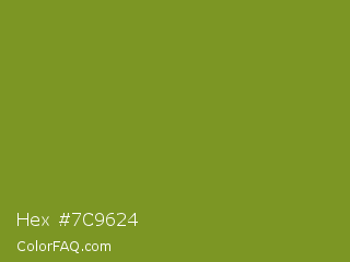 Hex #7c9624 Color is a normal lime color and the nearest color is Wasabi #788a25. Hex code #7c9624 and RGB value is rgb(124,150,36). In RGB color space, this color is composed of 49% red, 59% green, 14% blue, In CMYK color space, this color is composed of 17% cyan, 0% magenta, 76% yellow , 41% black , In HSL color space, this color has a hue angle of 74° , 61% saturation and 36% lightness.