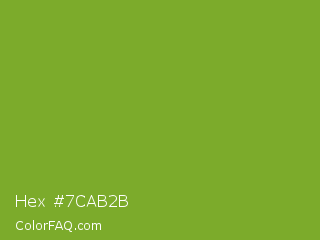 Hex #7cab2b Color is a normal green color and the nearest color is Sushi #87ab39. Hex code #7cab2b and RGB value is rgb(124,171,43). In RGB color space, this color is composed of 49% red, 67% green, 17% blue, In CMYK color space, this color is composed of 27% cyan, 0% magenta, 75% yellow , 33% black , In HSL color space, this color has a hue angle of 82° , 60% saturation and 42% lightness.