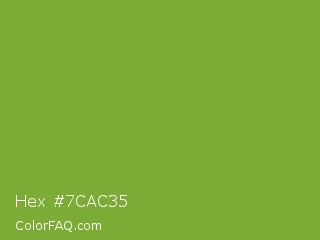 Hex #7cac35 Color is a normal green color and the nearest color is Sushi #87ab39. Hex code #7cac35 and RGB value is rgb(124,172,53). In RGB color space, this color is composed of 49% red, 67% green, 21% blue, In CMYK color space, this color is composed of 28% cyan, 0% magenta, 69% yellow , 33% black , In HSL color space, this color has a hue angle of 84° , 53% saturation and 44% lightness.