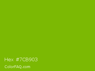 Hex #7cb903 Color is a normal green color and the nearest color is Apple Green #8db600. Hex code #7cb903 and RGB value is rgb(124,185,3). In RGB color space, this color is composed of 49% red, 73% green, 1% blue, In CMYK color space, this color is composed of 33% cyan, 0% magenta, 98% yellow , 27% black , In HSL color space, this color has a hue angle of 80° , 97% saturation and 37% lightness.