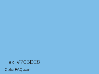 Hex #7cbde8 Color is a light blue color and the nearest color is Aero #7cb9e8. Hex code #7cbde8 and RGB value is rgb(124,189,232). In RGB color space, this color is composed of 49% red, 74% green, 91% blue, In CMYK color space, this color is composed of 47% cyan, 19% magenta, 0% yellow , 9% black , In HSL color space, this color has a hue angle of 204° , 70% saturation and 70% lightness.