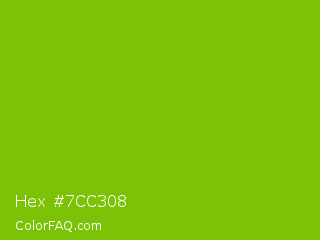 Hex #7cc308 Color is a normal green color and the nearest color is Lima #76bd17. Hex code #7cc308 and RGB value is rgb(124,195,8). In RGB color space, this color is composed of 49% red, 76% green, 3% blue, In CMYK color space, this color is composed of 36% cyan, 0% magenta, 96% yellow , 24% black , In HSL color space, this color has a hue angle of 83° , 92% saturation and 40% lightness.