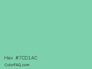 Hex #7cd1ac Color is a light green color and the nearest color is Vista Blue #8fd6b4. Hex code #7cd1ac and RGB value is rgb(124,209,172). In RGB color space, this color is composed of 49% red, 82% green, 67% blue, In CMYK color space, this color is composed of 41% cyan, 0% magenta, 18% yellow , 18% black , In HSL color space, this color has a hue angle of 154° , 48% saturation and 65% lightness.