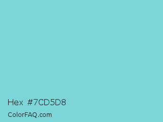Hex #7cd5d8 Color is a light cyan color and the nearest color is Middle Blue #7ed4e6. Hex code #7cd5d8 and RGB value is rgb(124,213,216). In RGB color space, this color is composed of 49% red, 84% green, 85% blue, In CMYK color space, this color is composed of 43% cyan, 1% magenta, 0% yellow , 15% black , In HSL color space, this color has a hue angle of 182° , 54% saturation and 67% lightness.