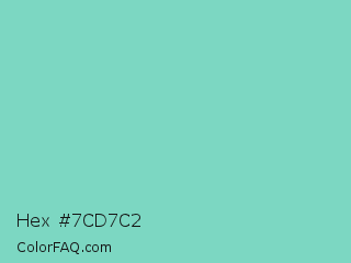 Hex #7cd7c2 Color is a light cyan color and the nearest color is Bermuda #7dd8c6. Hex code #7cd7c2 and RGB value is rgb(124,215,194). In RGB color space, this color is composed of 49% red, 84% green, 76% blue, In CMYK color space, this color is composed of 42% cyan, 0% magenta, 10% yellow , 16% black , In HSL color space, this color has a hue angle of 166° , 53% saturation and 66% lightness.