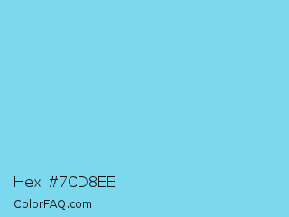 Hex #7cd8ee Color is a light cyan color and the nearest color is Medium Sky Blue #80daeb. Hex code #7cd8ee and RGB value is rgb(124,216,238). In RGB color space, this color is composed of 49% red, 85% green, 93% blue, In CMYK color space, this color is composed of 48% cyan, 9% magenta, 0% yellow , 7% black , In HSL color space, this color has a hue angle of 192° , 77% saturation and 71% lightness.