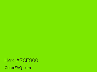 Hex #7ce800 Color is a normal green color and the nearest color is Alien Armpit #84de02. Hex code #7ce800 and RGB value is rgb(124,232,0). In RGB color space, this color is composed of 49% red, 91% green, 0% blue, In CMYK color space, this color is composed of 47% cyan, 0% magenta, 100% yellow , 9% black , In HSL color space, this color has a hue angle of 88° , 100% saturation and 45% lightness.